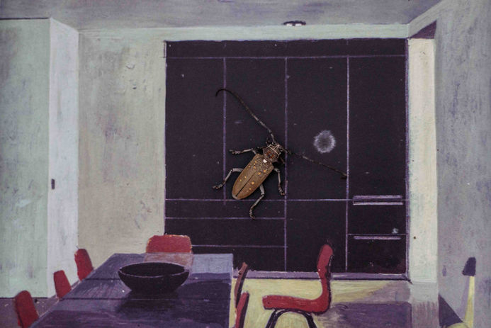 Plaster, coconut fiber, plastic, plants, fungi, bettle, cotton threads, Iron, Glass magnifier. The model exemplifies the pathological stance of the nation-state on promises over people’s lives, and conservations of more than [human] nature. Not depicted as sorrow on someone’s forever loss or policing over someone’s action but yet as mimesis of a distant witness, whose agency is never enough to talk about anything because his proximity is wider than the ocean's horizon, of a person’s rights are weaker because he seek relations beyond nation borders. This an architectural utopia in a dream, but scrambled within its awakened premises.